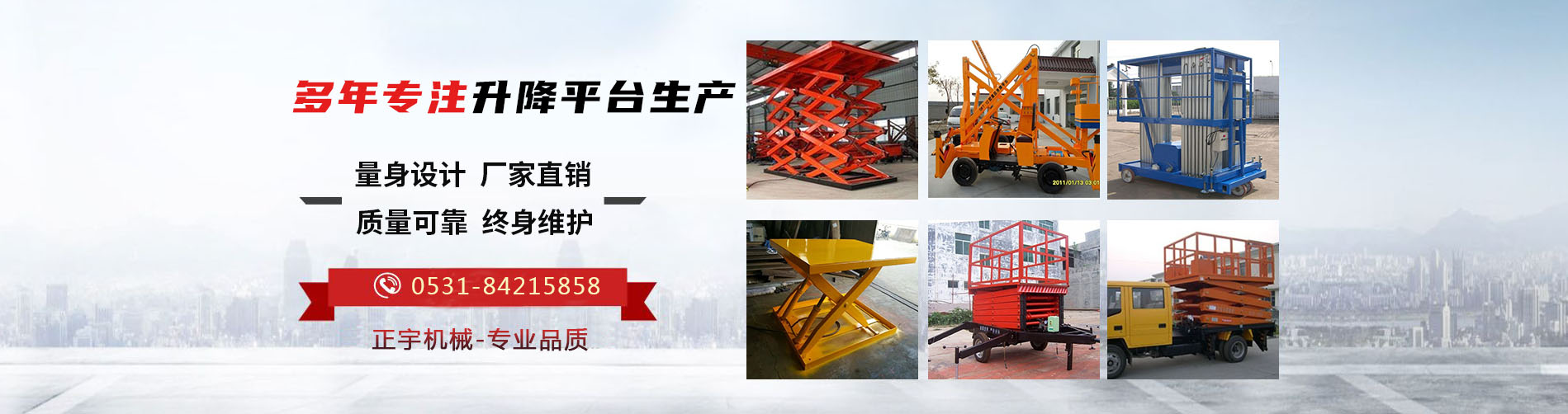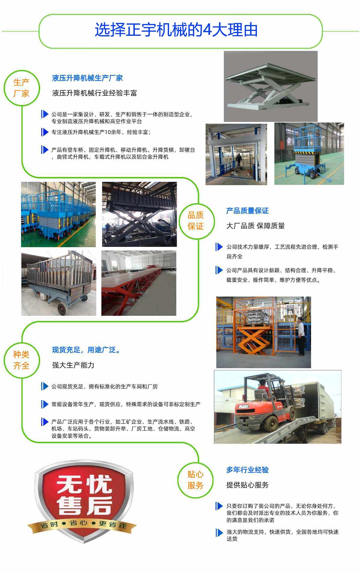 濟(jì)南正宇升降機(jī)械有限公司是一家集設(shè)計(jì)、研發(fā)、生產(chǎn)和銷售于一體的制造型企業(yè),生產(chǎn)液壓升降機(jī)械和高空作業(yè)平臺,公司處于素有泉城美稱的山東省濟(jì)南市,坐落于濟(jì)北開發(fā)區(qū)。優(yōu)越的地理位置和便利的交通給公司的發(fā)展帶來了充分的條件。正宇液壓技術(shù)力量厚,工藝流程先進(jìn)合理,檢測手段齊全。目前主要產(chǎn)品有:高空作業(yè)平臺、登車橋、固定升降機(jī)、移動(dòng)升降機(jī)以及鋁合金升降機(jī)等等。公司產(chǎn)品具有設(shè)計(jì)新穎、結(jié)構(gòu)合理、升降平穩(wěn)、載重安全、操作簡單、維護(hù)方便等優(yōu)點(diǎn)。產(chǎn)品廣泛應(yīng)用于各個(gè)行業(yè),如工礦企業(yè)、生產(chǎn)流水線、鐵路、機(jī)場、車站碼頭、貨物裝卸升舉、廠房工地、倉儲物流、高空設(shè)備安裝等場合。公司以誠信、創(chuàng)新、穩(wěn)健為宗旨,以品質(zhì)、完善服務(wù)的理念,迎接市場的挑戰(zhàn)。期待您的咨詢!